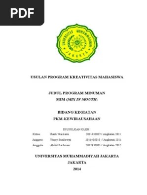 Proposal pkm simok singkong montok . Pada kesempatan kali ini kami mencoba mengusulkan proposal program kreativitas mahasiswa dalam bidang kewirausahaan yaitu berupa sebuah produk minuman yang . View tugas 14.docx from psy 132 at esa unggul university. Proposal pkm kewirausahaan pembuatan minuman kekinian "terpesona" disusun oleh : Membuatnya sendiri, oleh karena itu dimanfaatkanlah usaha minuman untuk.